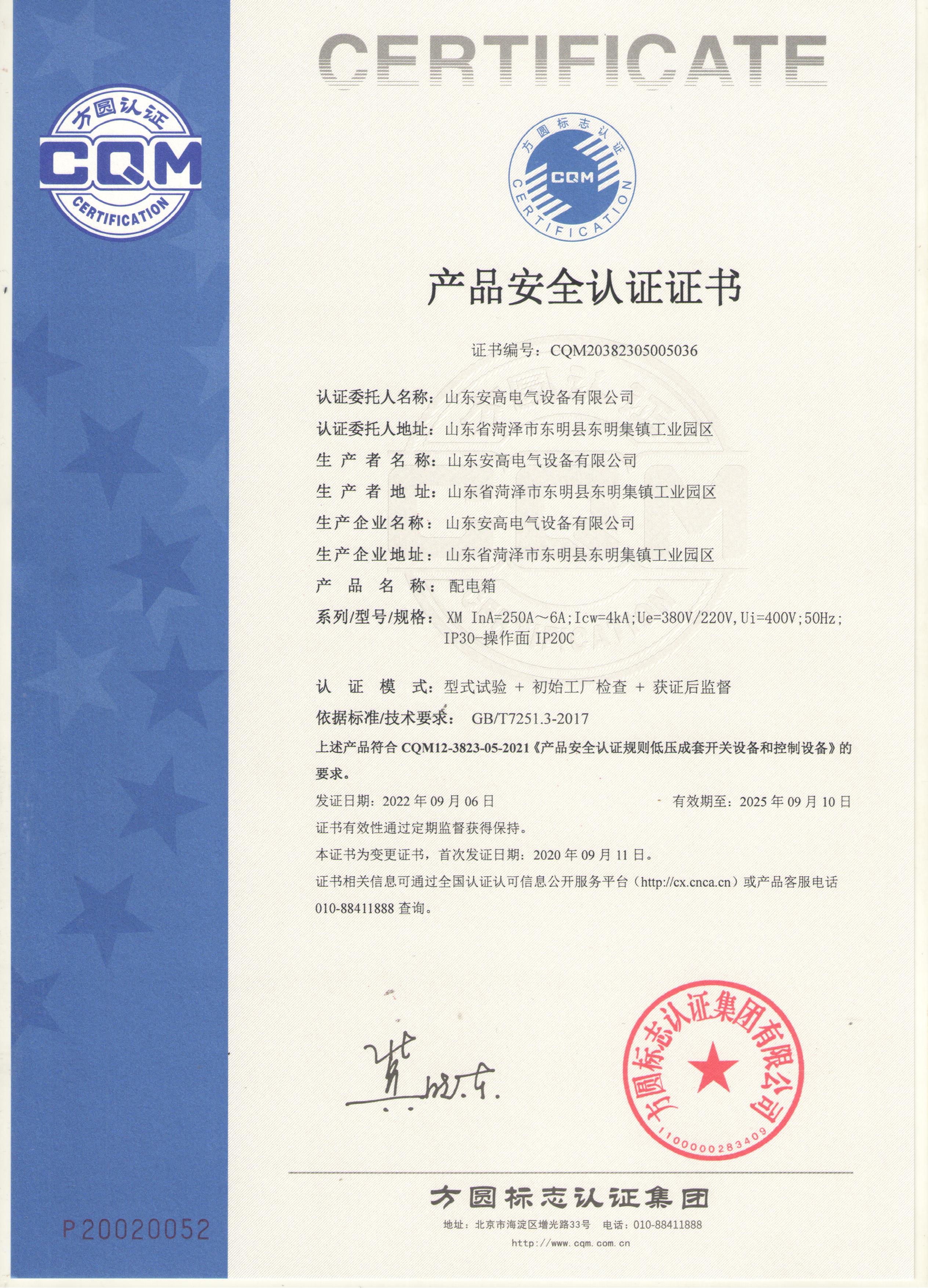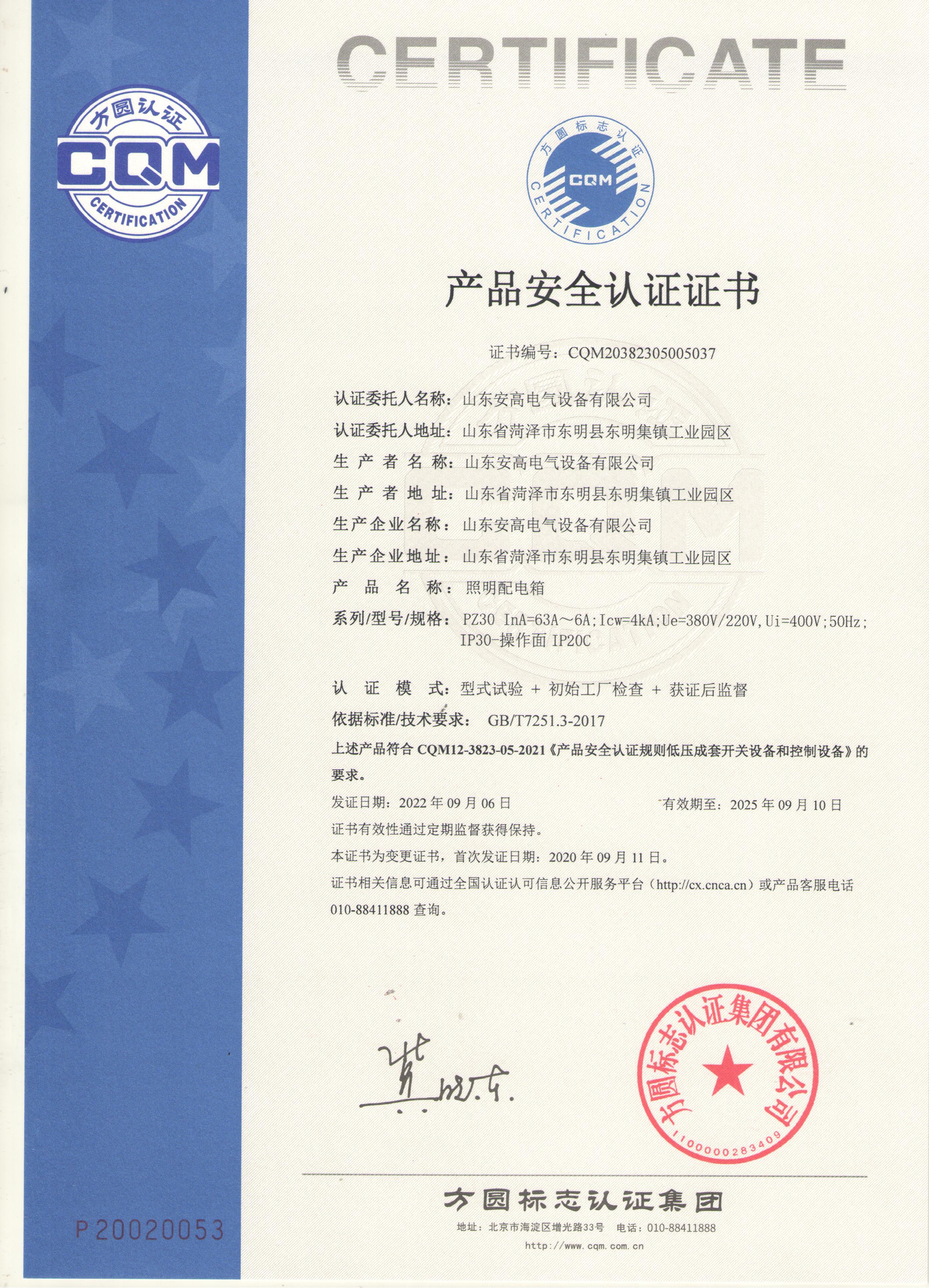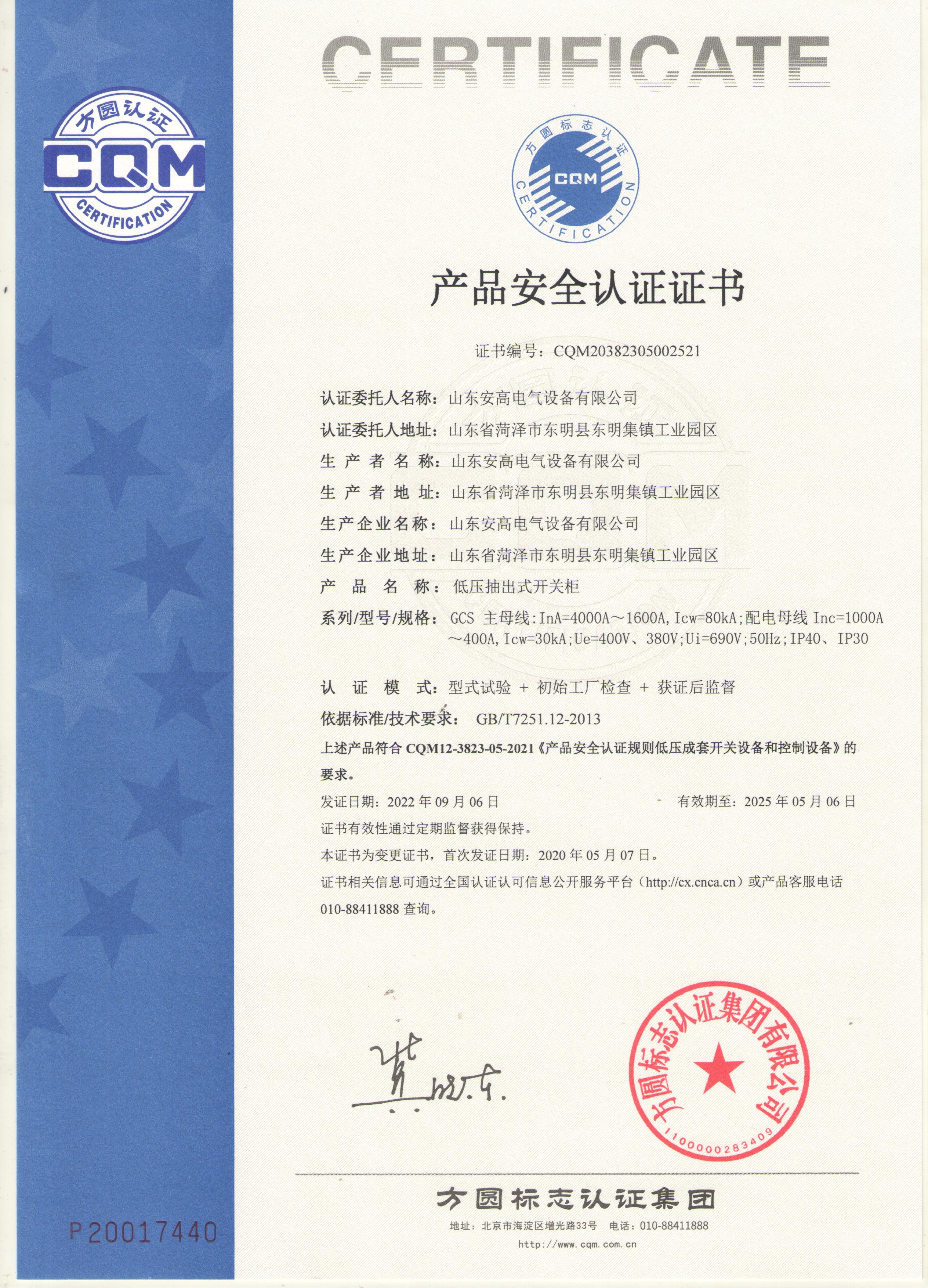 • 產品安全認證證書